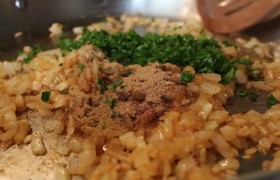- Порубленный лук минут 5 жарим в оставшемся жире, пока он станет полупрозрачным и мягким, одновременно впитывая в себя все, что осталось на дне сковороды. Приправляем тмином, кориандром, кайенским перцем и черным, солью, нарезанным чесноком, половиной (примерно 1 ст. ложка) рубленой петрушки, держим на огне еще пару минут.