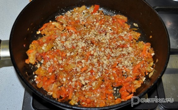 Засыпаем кинзу и измельченный чеснок. Прогреваем 3-4 минуты - и выключаем.