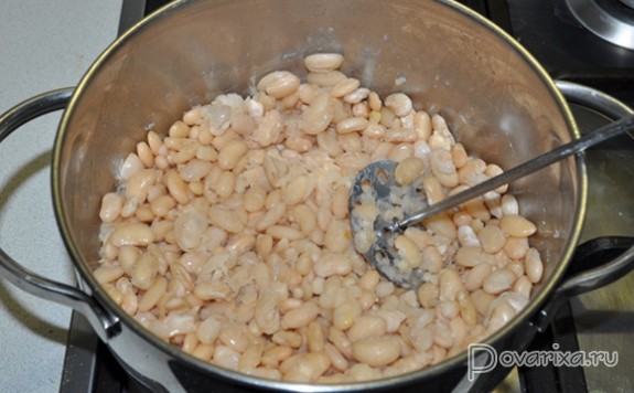 Сливаем отвар, слегка разминаем готовую фасоль, добавляем к овощам, перемешиваем, солим по вкусу, перчим.
