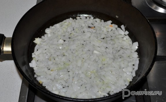 Мелко шинкуем лук, выкладываем в разогретое масло и пассеруем на огне меньше среднего, помешивая, 6-7 минут, пока станет прозрачным.