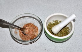 Лавровые листья ломаем на кусочки и растираем в ступке. Соединяем со всеми специями и приправами, перемешиваем тщательно. Промываем филе, снимаем остатки воды салфеткой, полотенцем. Малые филе – миньоны - мы оставили на месте.