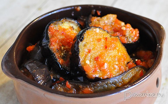 Теперь переливаем томатную массу в кастрюлю, где лежат кружочки баклажана, тоже перемешиваем – но осторожно, чтобы не сломать.