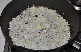 Разогреваем в сковороде на среднем огне масло, засыпаем лук, помешивая, 5-6 минут пассеруем.