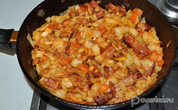 Добавляем томатную пасту, перчим и солим (хорошо еще подсыпать 2-3 щепотки трав – Прованских, Итальянских). Посыпаем перцем, солью, кладем сливочное масло. Снижаем огонь до малого, накрываем сковороду, оставляем тушиться до готовности – 20-25 минут. Капуста отдаст много сока, так что вода нам тут не нужна.
