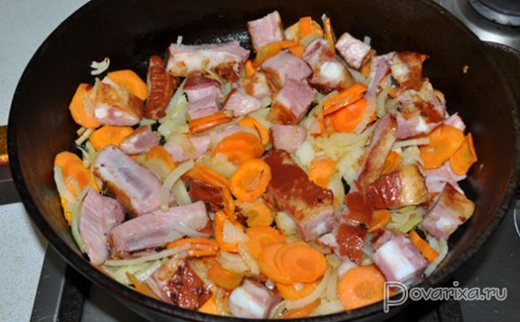 8-9 минут пассеруем овощи, помешивая. Закладываем ребрышки, держим на огне 3-4 минуты.