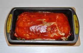 Пропустив мясо через мясорубку, смешиваем фарш с хлопьями, яйцами, горчицей, хмели-сунели, солью и перцами, а также с луком, который мы нашинковали средним кубиком и обжарили минут 5 на паре ст. ложек масла. Еще мы фарш отбиваем раз 18-20 – и плотно выкладываем в форму, сначала смазав ее маслом. Лопаткой разравниваем.