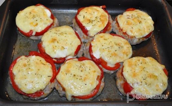 Сыр натираем крупно, смешиваем с майонезом в густую пасту, выкладываем на каждую котлету. Сверху слегка посыпаем Прованскими травами (можем взять Итальянские, или хмели-сунели).