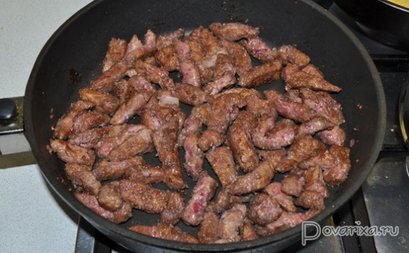 Теперь ставим на сильный огонь толстодонную сковороду, чтобы за 4-5 минут перекалилось масло для жарки. Печенку кладем в раскаленное масло, непрерывно перемешивая, обжариваем 2,5-3 минуты. Надрезаем кусочек – печень готова.