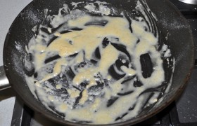 Готовим соус. На конфорке со средним огнем разогреваем в сковороде 3-4 ст. ложки сливочного масла. Рассыпаем из маленького ситечка муку, непрерывно помешивая – так она практически не образует комочков. Пассеруем, не переставая перемешивать, до светло-коричневатого оттенка.