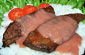 Муку смешиваем с перцем и солью, панируем ломтики печени. И сразу выкладываем в сковороду, где уже перекалились 3-4 ст. ложки растительного масла. Жарим каждую сторону до легкой корочки, примерно по 50-60 секунд. Проверяем – разрезанный ломтик внутри светлый, готовый.