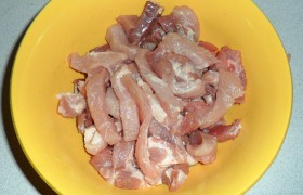 Мясная соломка у нас должна быть толщиной не более 7-8 мм, а значит, сначала мы поперек волокон нарезаем из куска мяса именно такой толщины ломти, отбиваем, а их уже превращаем в соломку. Посыпаем приправой и перемешиваем.