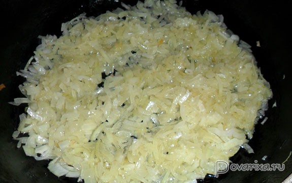 - Разогреваем на сильном огне сухую сковороду, наливаем растительное масло, когда разогреется – закладываем лук и сразу переводим на маленький огонь. Помешивая время от времени, томим лук, пока он не станет прозрачным.
