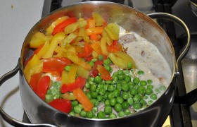 Добавляем сладкий перец. Кладем зеленый горошек.