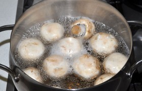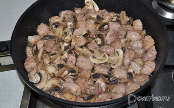 Мясо оставляем, а шампиньоны, протерев влажной салфеткой, кладем в кипящую воду и отвариваем 4-5 минут. Вынимаем, остыли – нарезаем ломтиками.