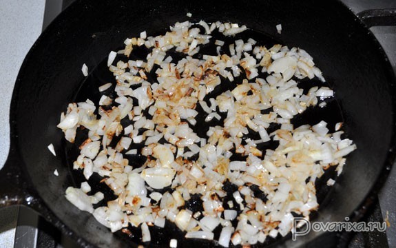 Шинкуем мелко лук, плоскостью ножа раздавливаем дольки чеснока, на среднем огне обжариваем 10-12 минут, перемешивая.