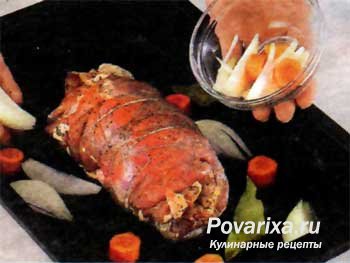 РусскаяГорячие, сочные ломти рулета из телятины, источающие смешанный аромат хорошо запеченного мяса, сыра и зелени - такое блюдо украсит праздничный стол. Удобен рулет и тем, что мясо можно замариновать заранее, а вынуть готовое блюдо из духовки как раз ко времени подачи на стол.
