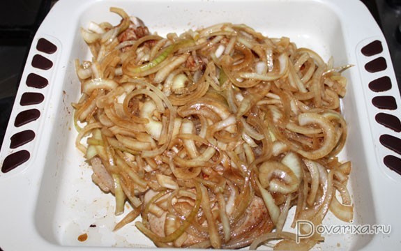 Засыпаем всем тем луком, в котором мариновалось мясо.