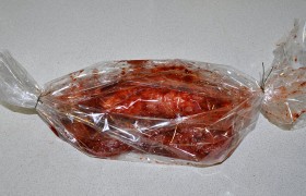 Смешиваем маринад – аджика, кетчуп, соль. Пробуем. Мясо обмазываем маринадом и закладываем в рукав.