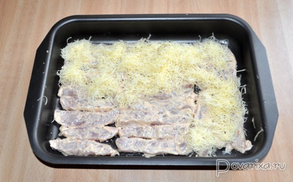 Поступаем, как при готовке обычных отбивных: промытое мясо обсушиваем в бумажных полотенцах. Точно поперек волокон разрезаем на ломти 12-15 мм толщины. И слегка, в пакетике, отбиваем с обеих сторон. Отделяем жир и нарезаем полоски-палочки шириной 15-20 мм.