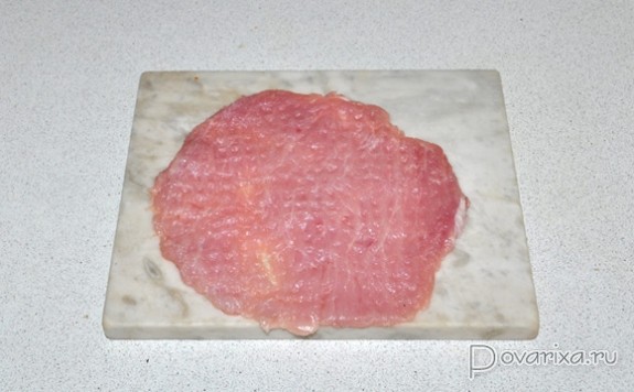 Каждый закладываем в пакет, который оберегает мясо от повреждений, а нас от возможных капель сока. Отбиваем мясо до 7-8 мм.