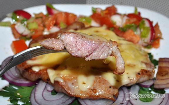 Перевернув, засыпаем верх отбивных тертым крупно сыром и на 30 секунд накрываем сковороду крышкой. Сыр быстро плавится, вторая сторона отбивной жарится тоже только 1 минуту.