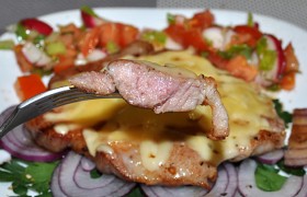 Чтобы получить сырную корочку, мы не запекаем мясо в духовке. Вся готовка – на одной сковороде. Получается очень быстро, несложно – только мясо, сыр и приправы, очень сочно и вкусно.