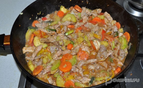 Заранее нарезаем овощи: лук и кабачок – четвертинками кружков, морковь – кружками, помидоры – дольками, сладкий перец – по желанию. Теперь кладем их в сковороду, жарим, перемешивая, минут 10-15, снизив огонь до средне-сильного.