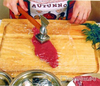 - Один из секретов хорошего шницеля – правильная отбивка мяса. Так что прорезаем имеющиеся жилки острым ножом, надрезаем край из сала, если он есть на наших кусках, помещаем каждый кусок в прозрачный пищевой пакет и отбиваем с обеих сторон, пока ломти станут действительно тонкими и сильно увеличатся в размерах.