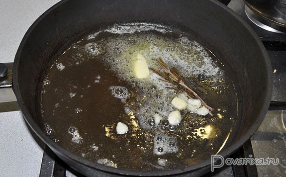 Включаем сильный огонь, ставим сковороду с маслом, чесноком и розмарином. Масло раскаляется и ароматизируется.
