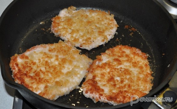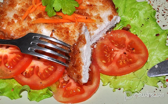 Обжариваем, как обычно: сначала раскаляем масло на сильном огне, затем жарим с каждой стороны не больше минуты. Даем мясу отдохнуть пару минут и подаем. И теперь зацените исключительный вкус хлебной панировки.