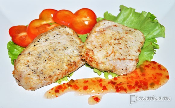 Как обычно для отбивных – сначала перекаливаем масло в толстодонной сковороде (4-5 мин.). Кладем мясо, обжариваем каждую сторону не более 60-65 секунд. Перевернув отбивные, солим их.