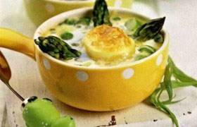 ФранцузскаяЯйца, запеченные со спаржей и зеленым горошком - отличная идея для воскресного завтрака, а возможно, и ужина для двоих - красивого, легкого и полезного. Нужны только симпатичные небольшие формочки для запекания.