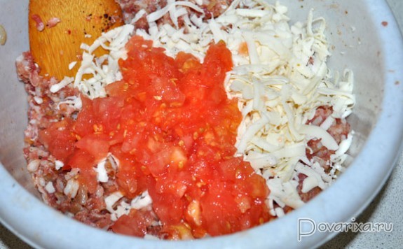 Вынутую мякоть рубим и добавляем в начинку (от половины до почти стакана) вместе с тертым сыром, вымешиваем.