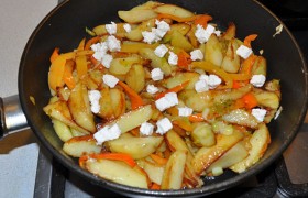 В Греции, в которой, как известно, «всё есть», любят картофель не меньше, чем у нас. Так что сегодня давайте попробуем картофель, жаренный по-гречески – со сладким перцем, луком-пореем и кубиками брынзы.
