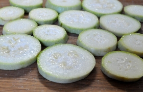 Промытые и обсушенные кабачки нарезаем кружками 6-8 мм толщиной. Раскладываем, посыпаем слегка солью и оставляем на 12-15 минут.