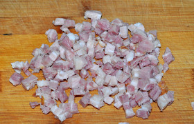 Ветчину нарезаем мелкими кубиками, добавляем в миску с фаршем.