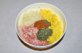В миску с фаршем добавляем измельченный лук и натертую на мелкой терке вареную картошку. А также специи и приправы.