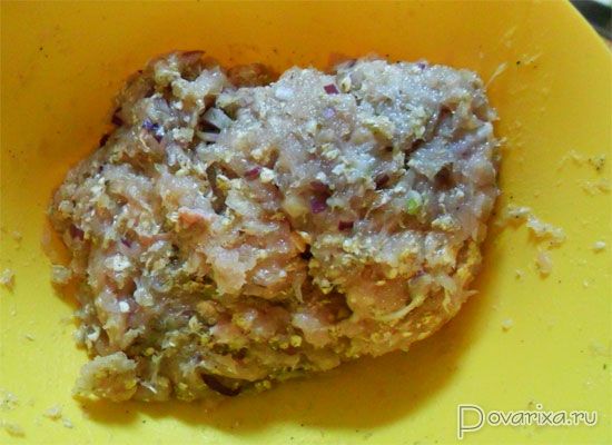 - Горсть хлопьев засыпаем в куриный фарш, перемешиваем – пусть хлопья набухают. Можно быстро смолоть хлопья на кофемолке или ручным блендером – при желании.