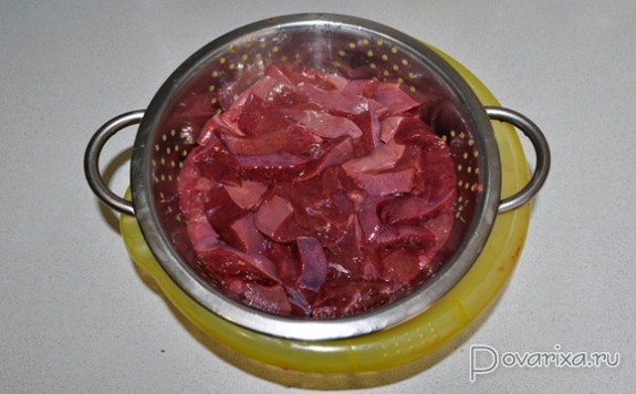 Печень промываем Оставляем в дуршлаге, а затем на доске для обсушки.