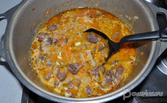 Сердечки лучше предварительно замочить в воде, однако можно готовить и сразу, только промыв их. Но начинаем мы с обжарки нашинкованного полукольцами лука - на сильном огне и перекаленном растительном масле. Точнее, при частом помешивании в течение 4-5 минут он не жарится, а просто становится прозрачным.