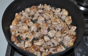 Масло за 4-5 минут перекаливается на сильном огне. Закладываем кусочки мяса, разравниваем, жарим 1,5-2 минуты, переворачиваем, перемешиваем, обжариваем еще немного, пока кусочки все станут светлыми.