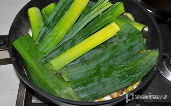 Лук-порей промываем, промокаем воду. Отделяем листья, стебель нарезаем ломтиками по 4-5 мм толщиной. На огне выше среднего обжариваем 3-4 минуты в смеси сливочного и растительного масла.