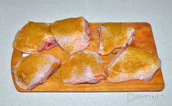 Промытые бедрышки максимально обсушиваем: вода не нужна для их жарки. Сбрызгиваем соком лимона, с обеих сторон посыпаем готовой приправой (любимыми специями). Приправа ложится ровнее, если сыпать через ситечко.