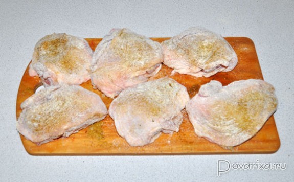 Ставим на огонь между средним и сильным просторную сковороду, масло 5-6 минут перекаливаем. Эти минуты тратим на панировку бедрышек в муке, слой – тонкий, лишнее стряхиваем.