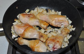 Раздвигая лук, перекладываем сюда же куриные ножки, жарим 2-3 минуты.