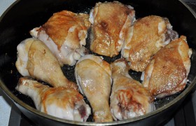 Если кусков курицы у нас 500-600 г, то грибов и специй кладем меньше. Обжарив курицу, добавляем грибы, жарим их вместе с курицей, заливаем соусом и тушим в сковороде.