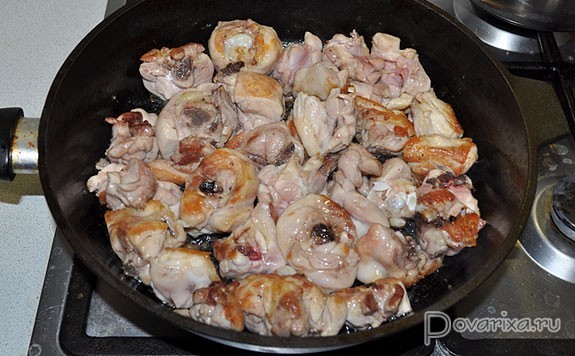 Раскаляем толстодонную сковороду с маслом на сильном огне. Раскладываем кусочки курицы, 2-3 минуты не трогаем их, пока они поджариваются снизу. Подрумянились – переворачиваем и, помешивая, обжариваем 6-7 минут.