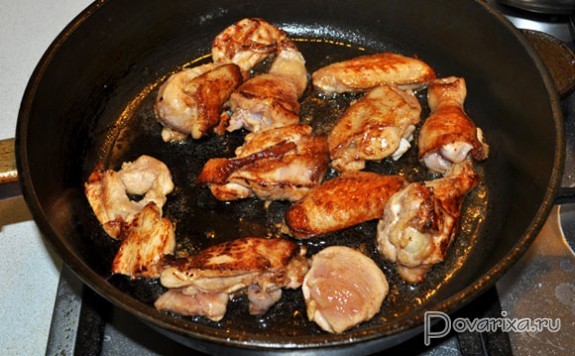 В сковороду - 2-3 ст. ложки масла, 3-4 минуты оно перекаливается. Убираем огонь до средне-сильного, выкладываем половину кусочков курицы, жарим примерно минуту до корочки, переворачиваем, еще убираем огонь – до среднего, на нем дожариваем курицу 1,5-2 минуты. Убрав курицу, даем маслу снова перекалиться и жарим в том же режиме вторую порцию.