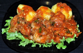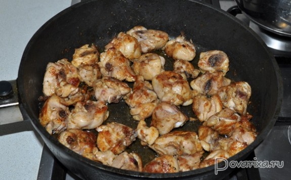 Перекаливаем на сильном огне 1-2 ст. ложки масла в сковороде, закладываем куриные кусочки, не снижая огня, обжариваем мясо 3-5 минут до корочек, помешивая. Выключаем,накрываем.