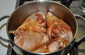 В просторной сковороде раскаляем 4-5 минут масло на сильном огне. И на нем обжариваем ножки со всех сторон до очень румяных корочек. Выкладываем в посуду для тушения.